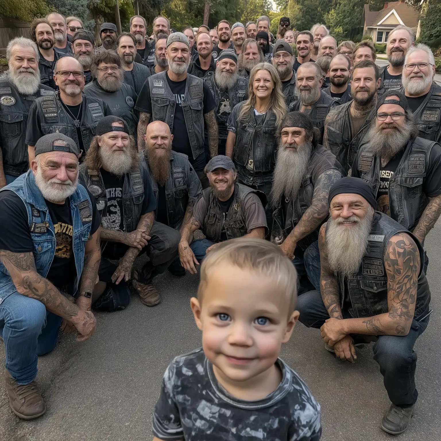Timothy ran straight into Tank’s arms, and this mountain of a man—who had likely witnessed more tragedy than most people ever would—simply held the small boy while forty-six other bikers stood silently at attention in the school parking lot.
