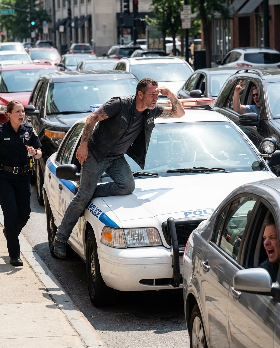 A Biker Climbed Onto a Police Car in the Middle of Traffic — Bystanders Shouted “Arrest Him” Until the Window Fogged Over“Get off that car right now!” someone yelled as a leather-clad biker climbed onto the hood of a marked police cruiser, boots scraping metal, traffic locked in every lane—while inside the sealed vehicle, something no one noticed kept growing quieter.