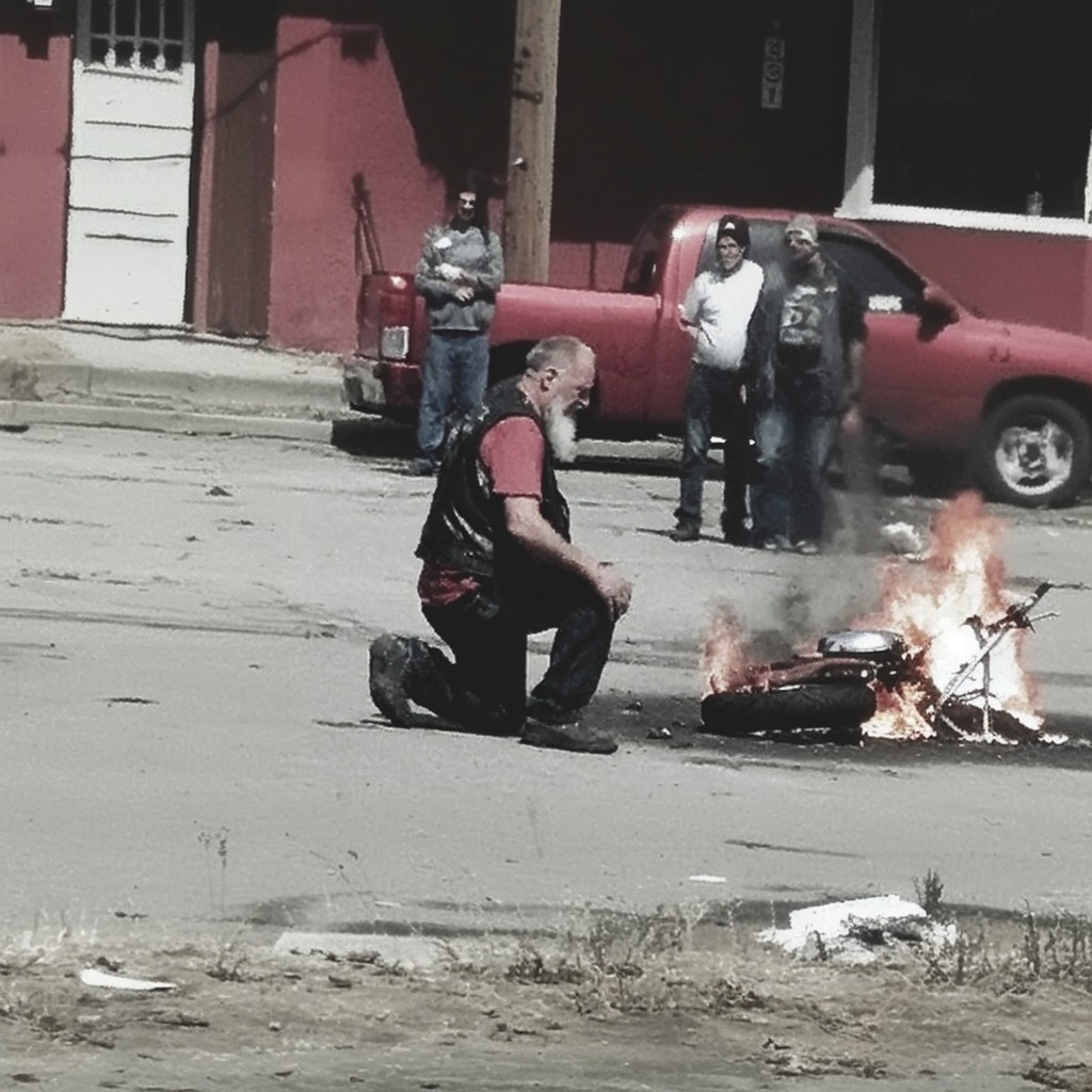A biker set his own motorcycle on fire in the middle of the street, then dropped to his knees and cried as forty years of his life burned in front of him.