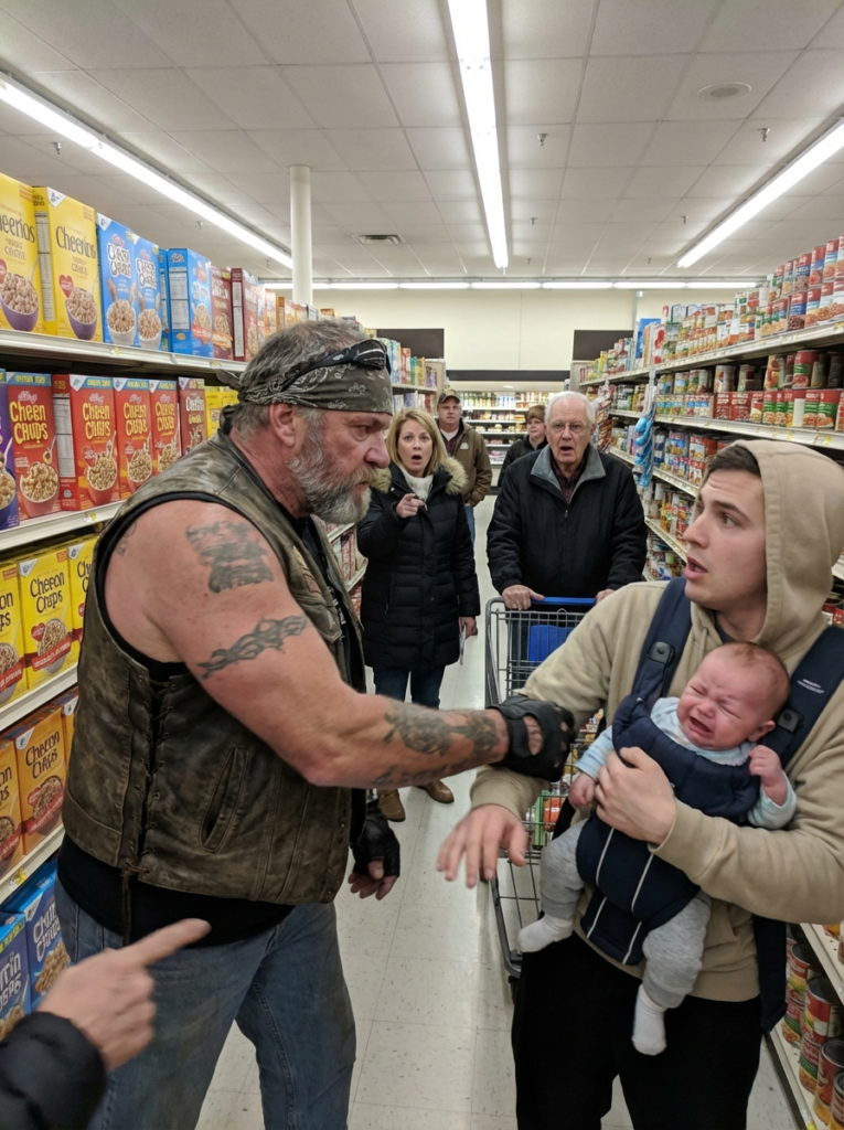 A quiet grocery store line erupted into chaos when a large, tattooed biker suddenly slapped the hand of a man holding a baby, sending something small clattering onto the floor—while shocked customers gasped and shouted, unaware they were blaming the wrong person.