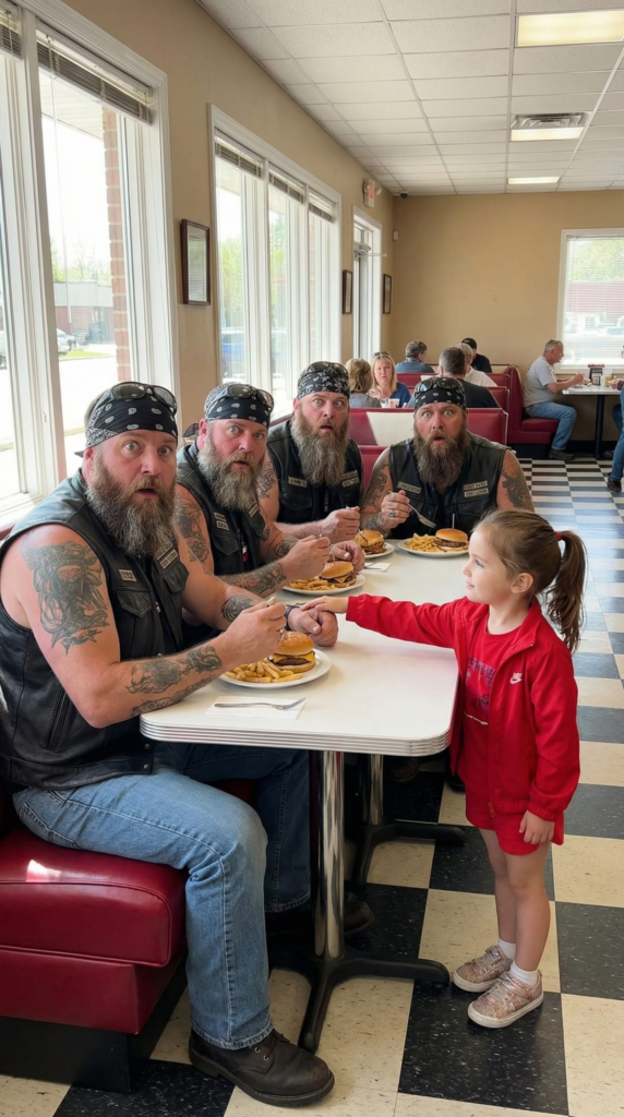 In the corner booth, five men sat together. Their leather vests, worn smooth by years of wind and sun, seemed to bend the atmosphere around them, not because they sought attention, but because experience settled into their posture. They spoke easily among themselves, their laughter low — the kind that comes from shared history rather than inside jokes.