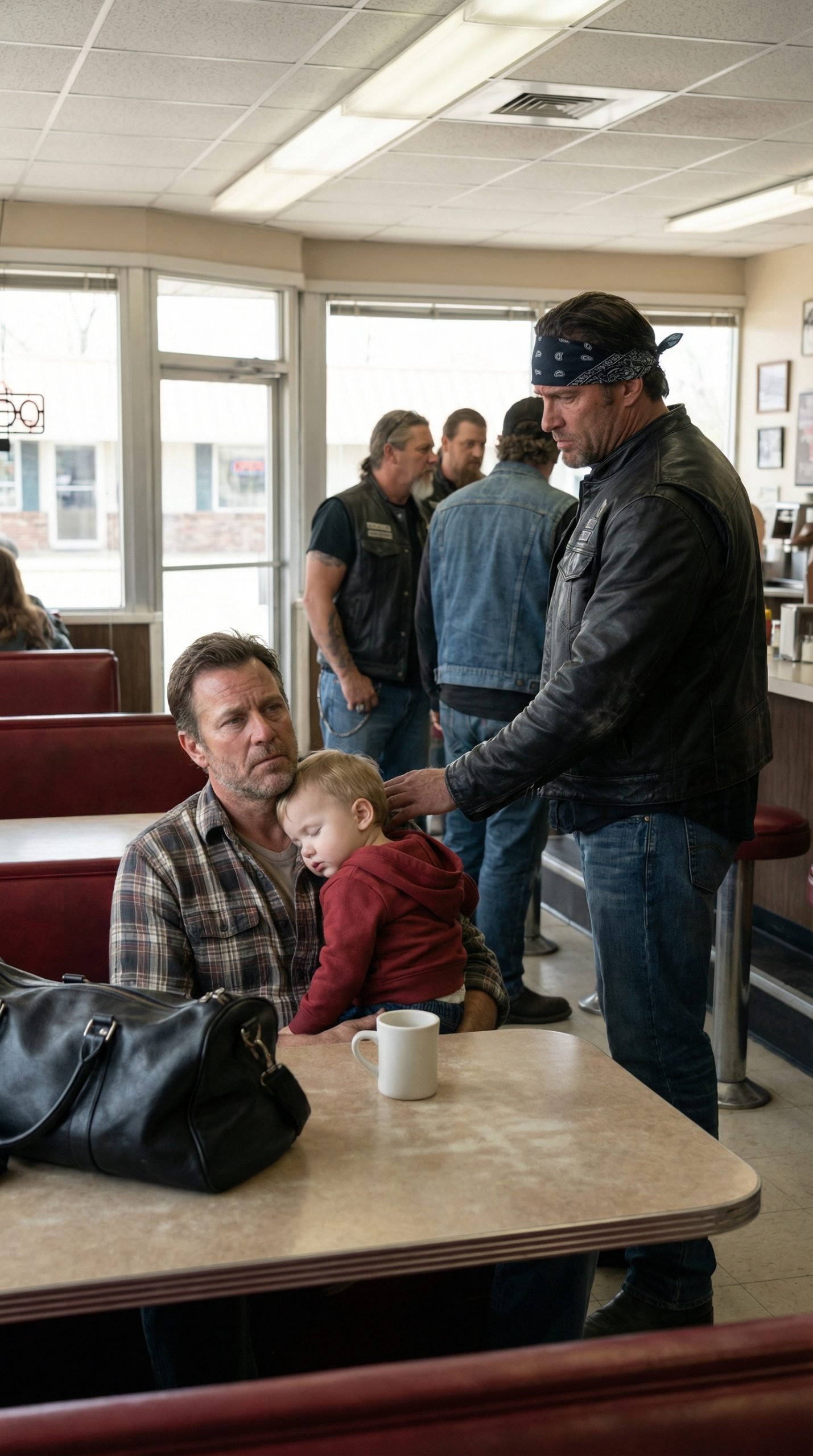 The diner sat alone along a stretch of highway that most people only noticed when they were already tired, hungry, or lost. Just after sunrise, when the world still felt undecided about waking up, a man named Oliver Haines pushed open the door with his shoulder, his hand wrapped protectively around his young son.