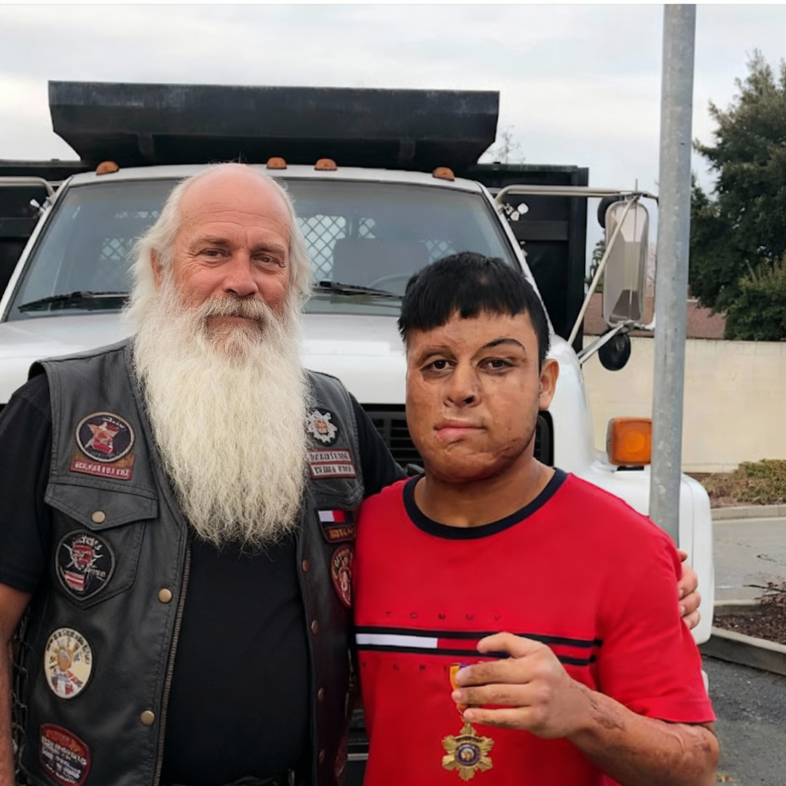 This biker gave my burned son his Purple Heart after nobody else would even look at him. I watched this stranger with a white beard and a worn leather vest walk straight toward my boy while everyone else turned away—and in that moment, I knew something extraordinary was about to happen.
