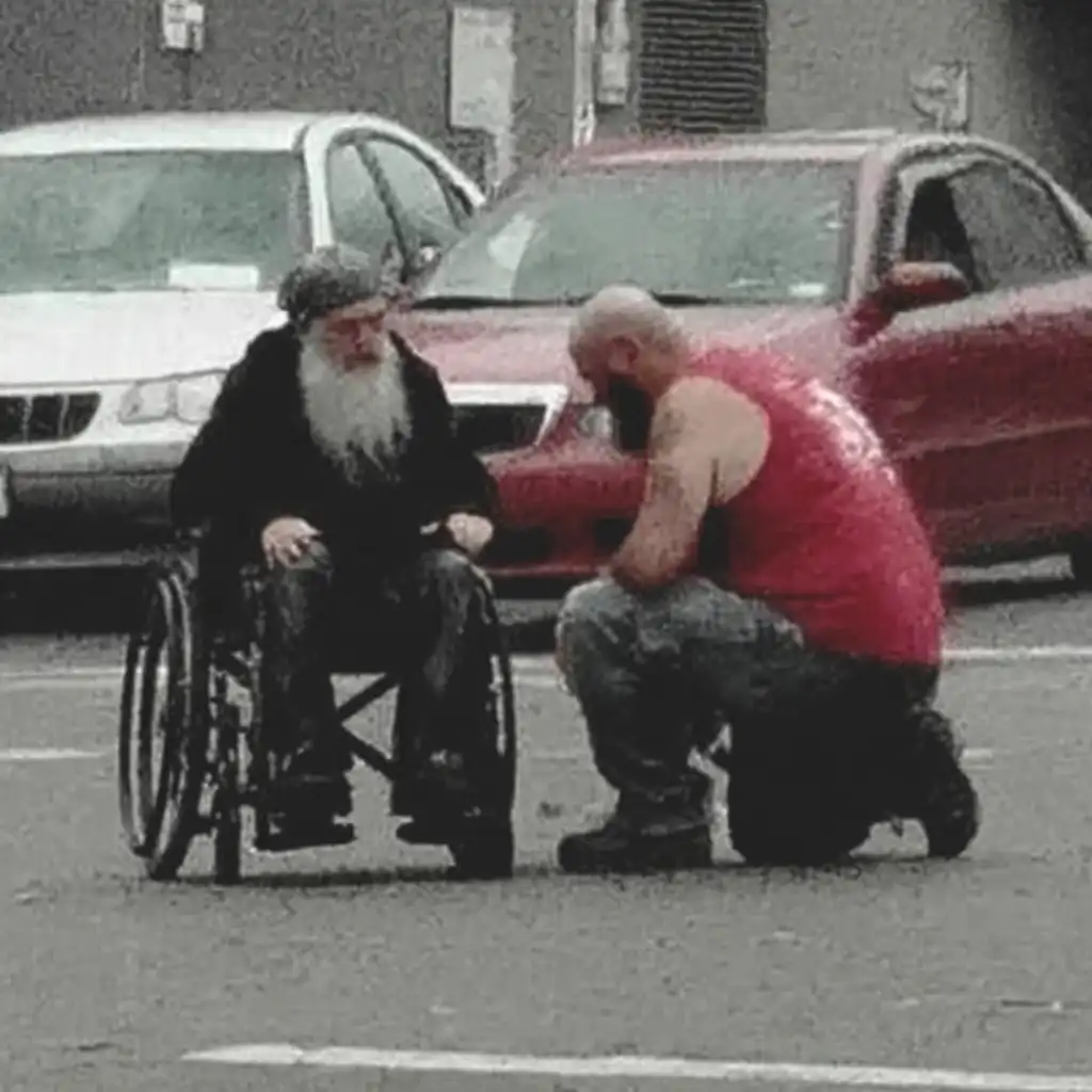Without saying another word, the biker knelt down beside the chair. His knees cracked loudly as he lowered himself onto the pavement.