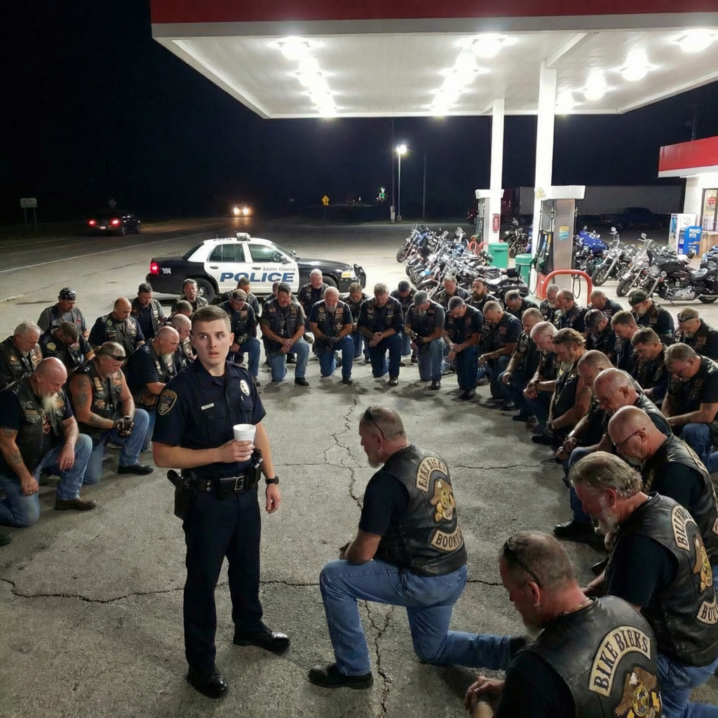 Fifty bikers surrounded a rookie cop at a gas station.