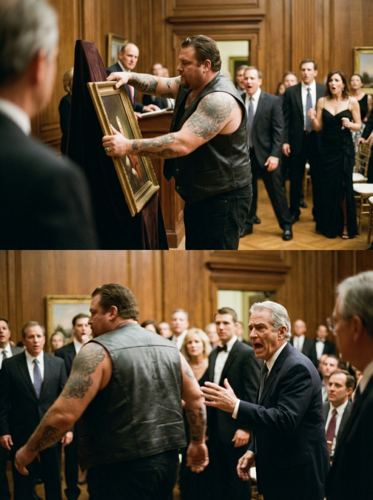 A biker stormed into a live auction, snatched the painting that had just been sold, and ran out in front of everyone—until the buyer suddenly shouted something no one expected.