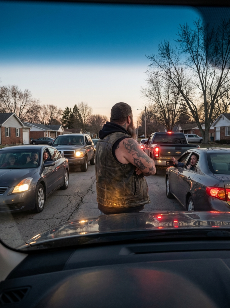 He was standing directly in the middle of the road—planted between both lanes—his body positioned in a way that made it impossible for any car to move forward without confronting him first.