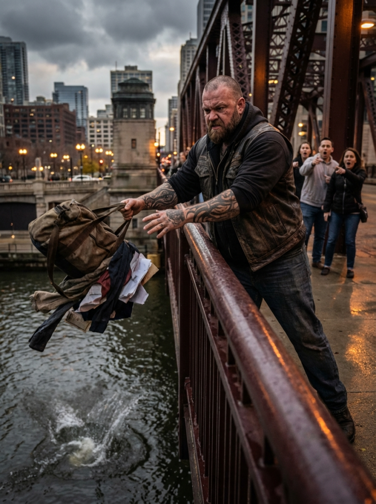 A heavily tattooed biker stood on the edge of a bridge and calmly threw his wallet, his phone, and then his entire duffel bag into the river below—right in front of dozens of stunned strangers—leaving everyone asking the same question: