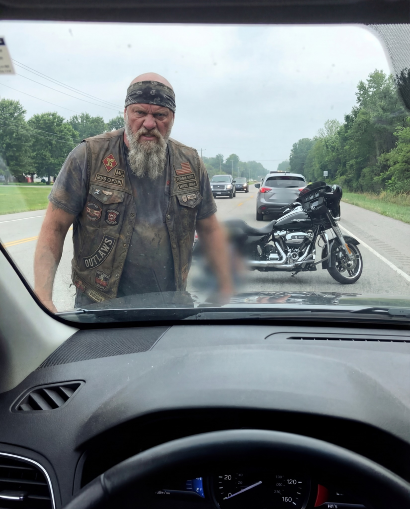 He sat astride a huge black Harley, broad shoulders wrapped in worn leather, tattooed forearms bare in the morning sun, engine off, bike planted sideways like a barricade. He was blocking both lanes. Completely still. Not moving. Not even looking back.