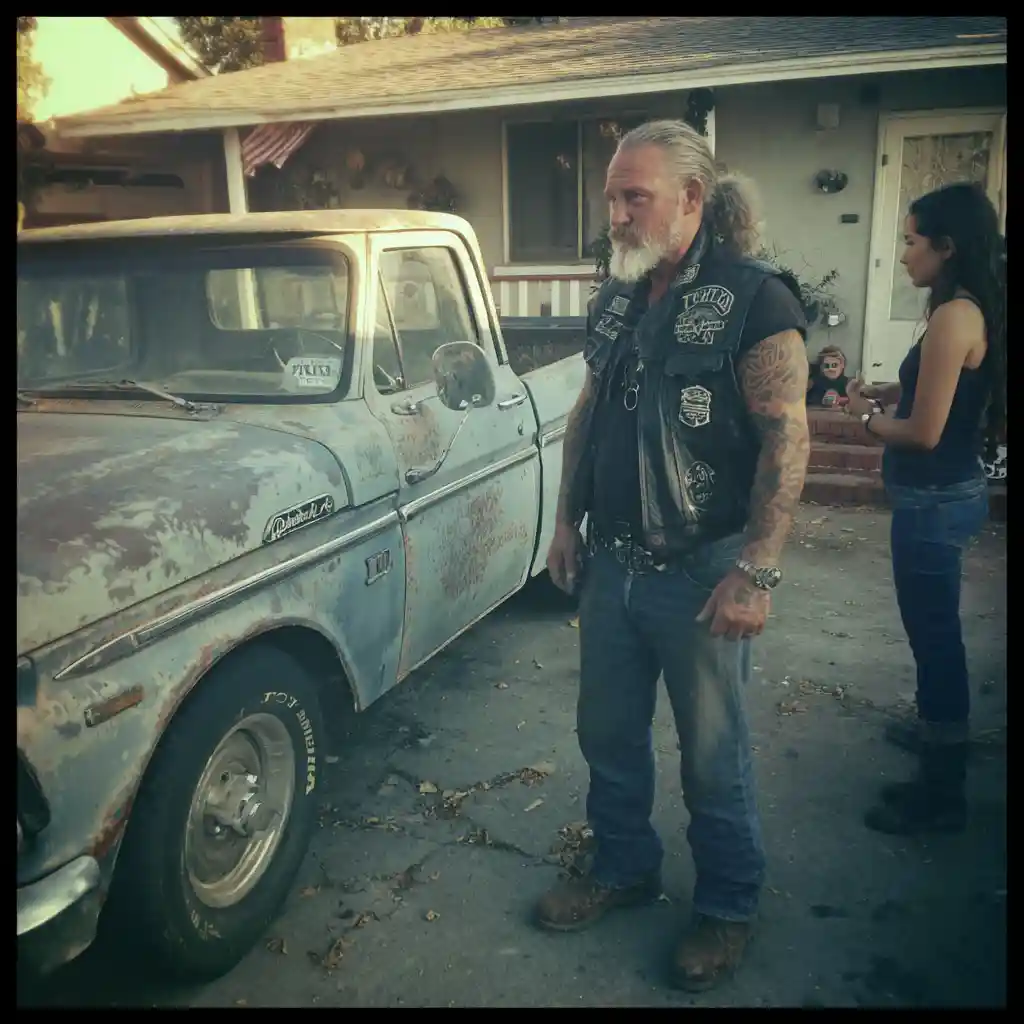 Forty minutes later, a man pulled into my mom’s driveway on a Harley. Big guy. Probably sixty. Leather vest. Gray ponytail. He got off his bike and just stood there staring at the truck.