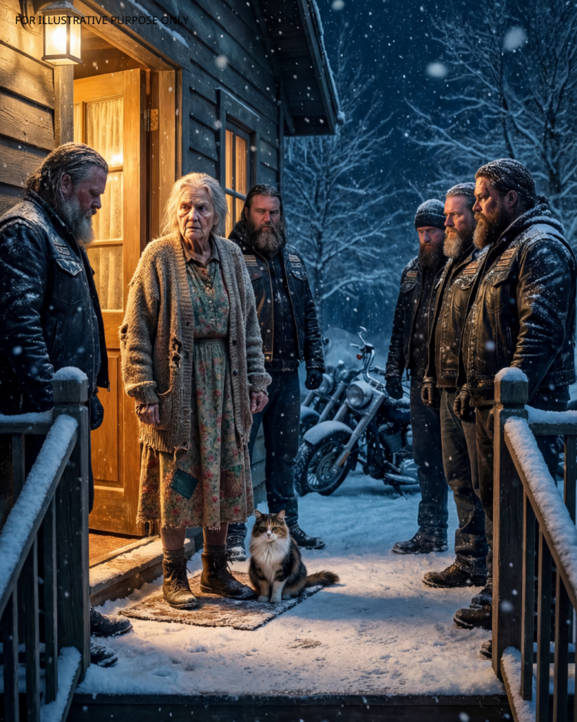 They stood there—nine men in soaked leather, faces half-hidden under helmets and scarves, shoulders dusted in white. The biggest one stepped forward. Broad. Bearded. Eyes hard like flint.