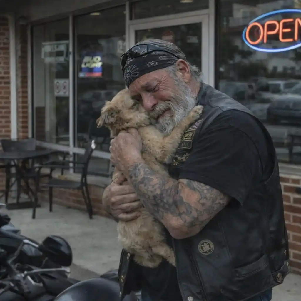He stood beside his motorcycle, holding a dog like it was the only thing keeping him from falling apart. And he wasn’t just tearing up—he was sobbing. Deep, uncontrollable sobs that came from somewhere far beneath the surface.