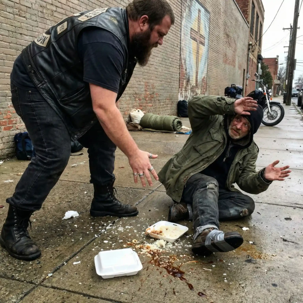 “Biker assaults homeless man and destroys his food in broad daylight.”