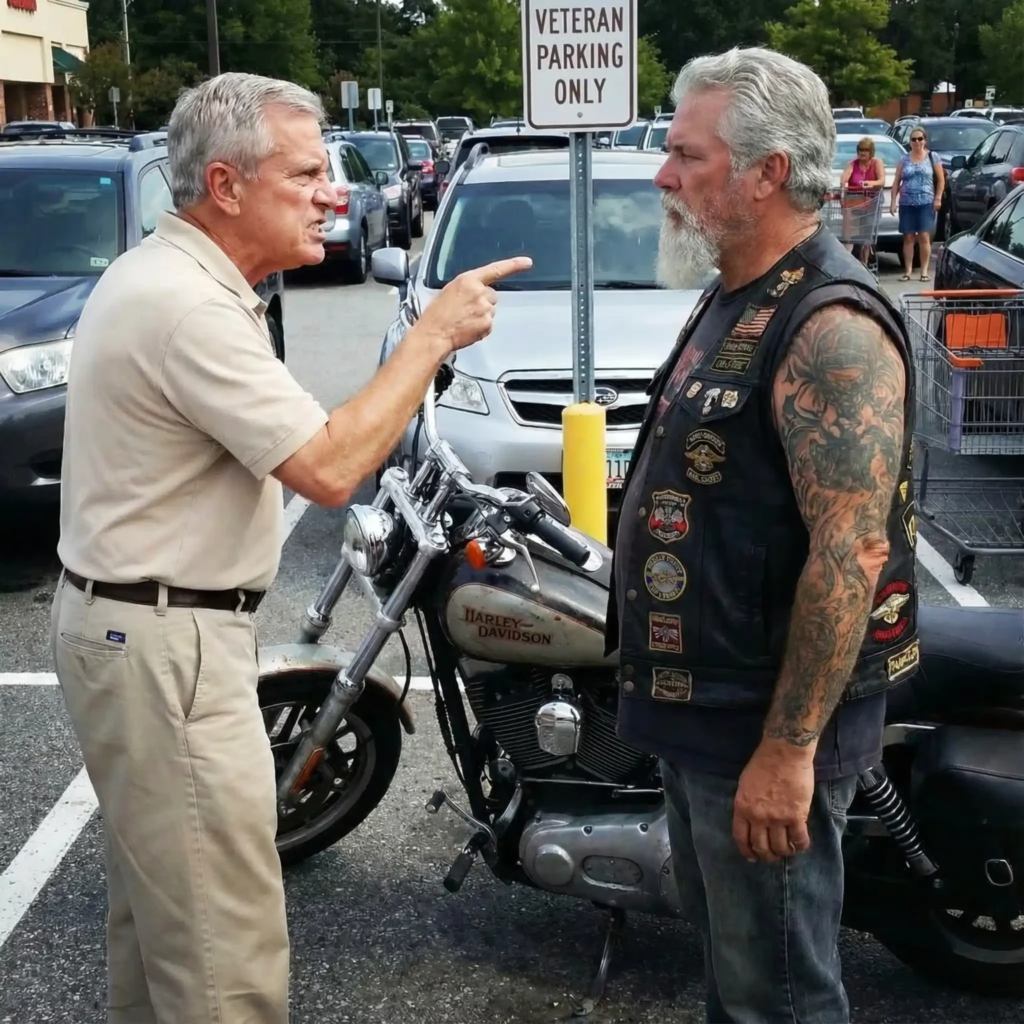 A beat-up Harley roared into the lot and pulled straight into the “Veteran Only” parking space.