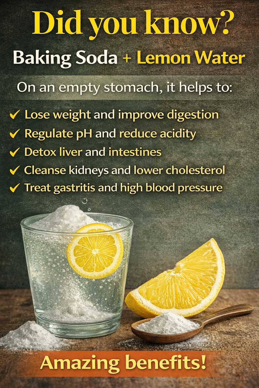 Lemon water is already one of the most popular healthy habits around the world — refreshing, hydrating, and simple. Adding a small amount of baking soda (sodium bicarbonate) to lemon water has become a trend, with many people claiming benefits for digestion, detox, and overall wellness. But what does science say about it? This article explains the potential benefits, how it’s used, and important safety tips.