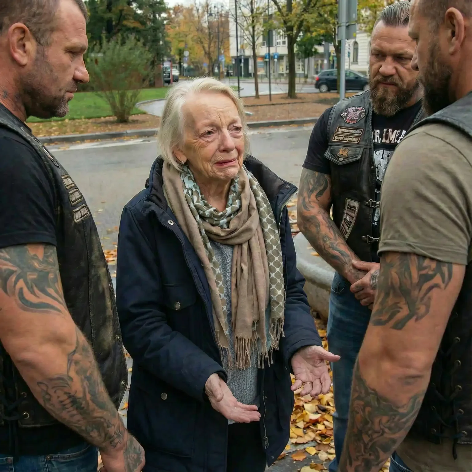 Three bikers saw an old woman standing in the rain with garbage bags…