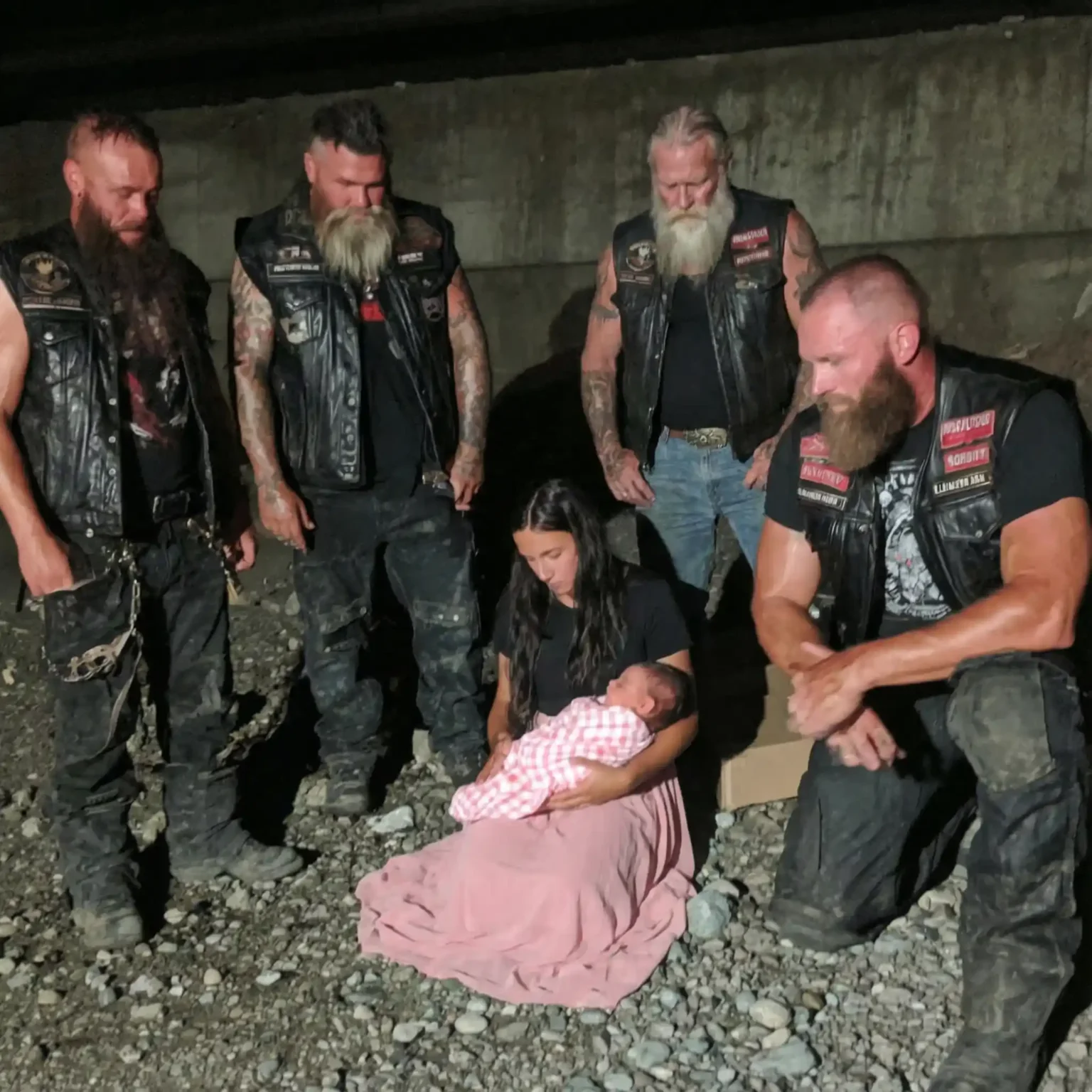 Five massive men wearing leather vests surrounded the cardboard box I had been living in for nearly three weeks. When they saw my two-month-old daughter wrapped in my dirty jacket, the biggest one suddenly dropped to his knees and started crying.