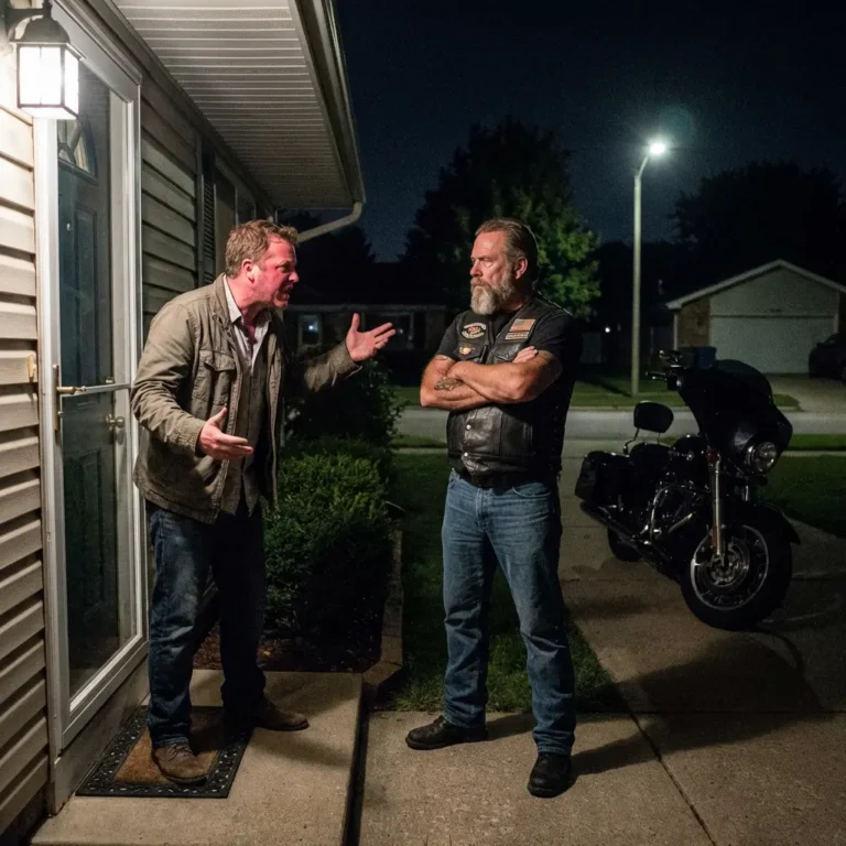 We’d let a stupid argument turn into silence, the kind that stretches so long it starts to feel permanent. But there he was—standing on my porch in his leather vest, engine still rumbling outside like something unfinished had finally come back.
