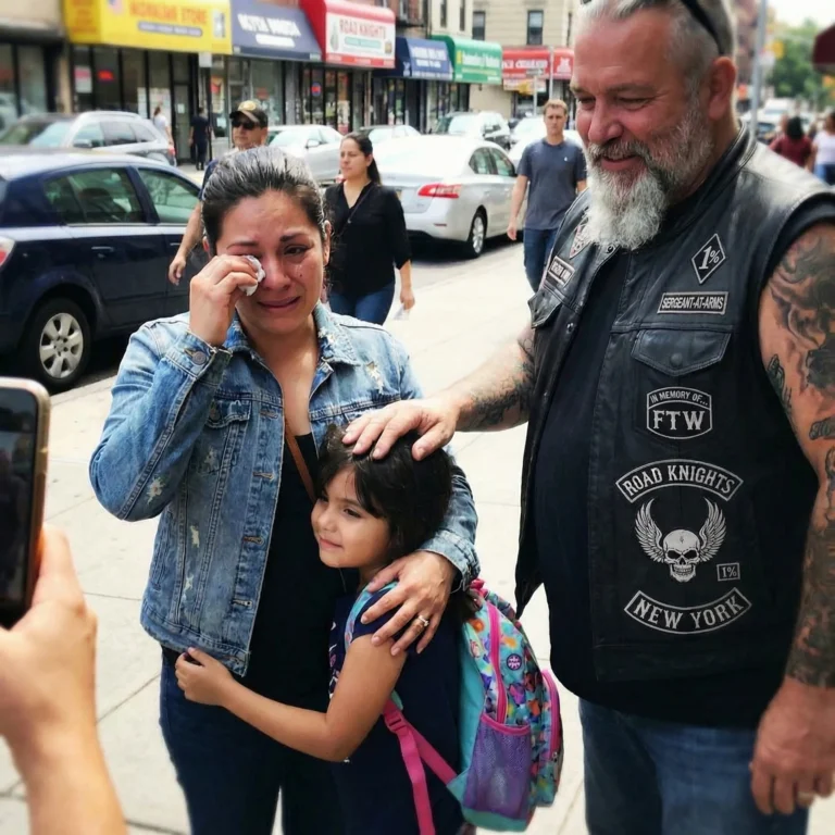 The biker caught the man’s knife wrist with both hands just before the blade came down. They slammed sideways into the van so hard the whole panel rattled. The man was younger, maybe thirty, frantic and wild. The biker was stronger, heavier, controlled.