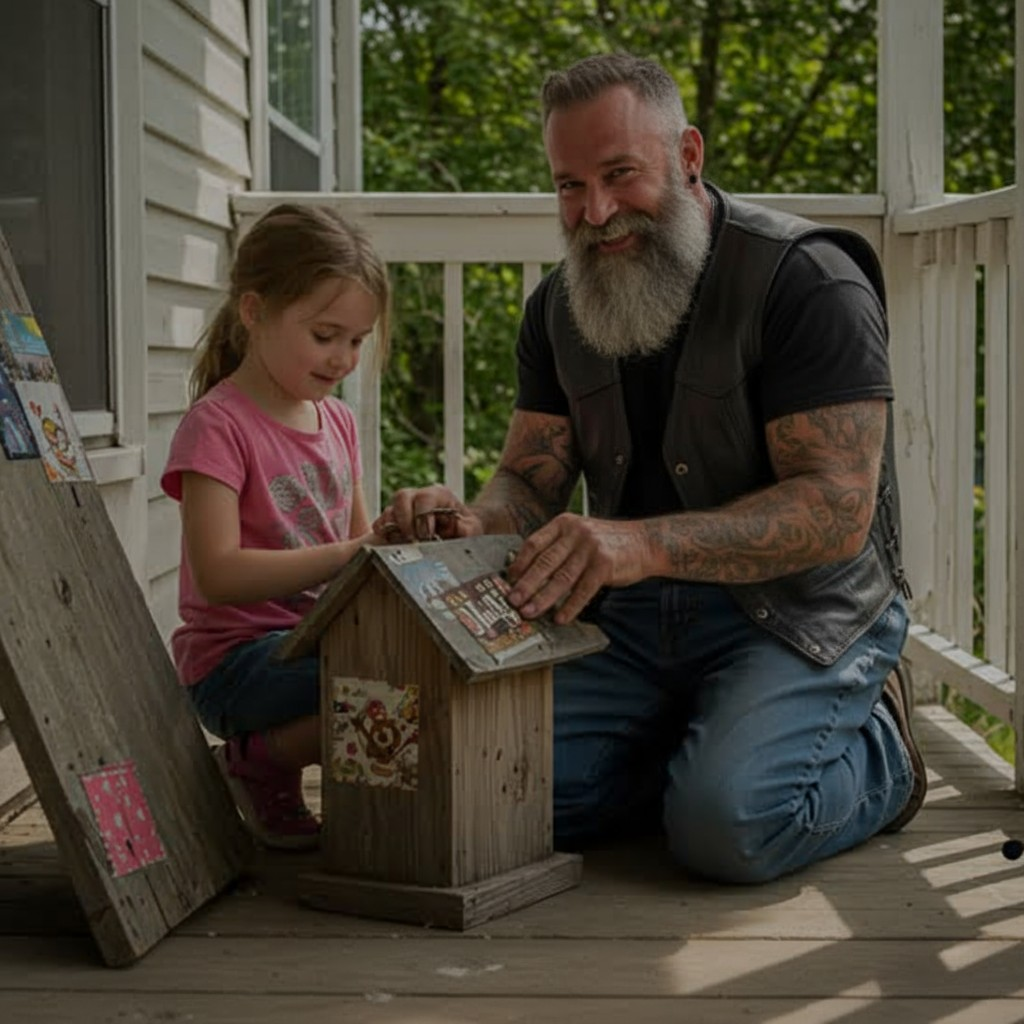 Har Saturday subah 9 baje ek tattooed biker hamare ghar aata tha… sirf meri 6 saal ki beti ke saath birdhouses banane ke liye. Aur mujhe bilkul pata nahi tha ke woh kaun hai.