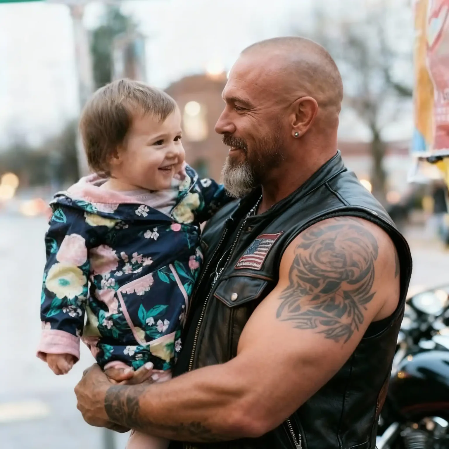 I watched from across the parking lot as this massive, tattooed man in a leather vest cradled my fifteen-month-old daughter against his chest while she giggled and grabbed his beard.