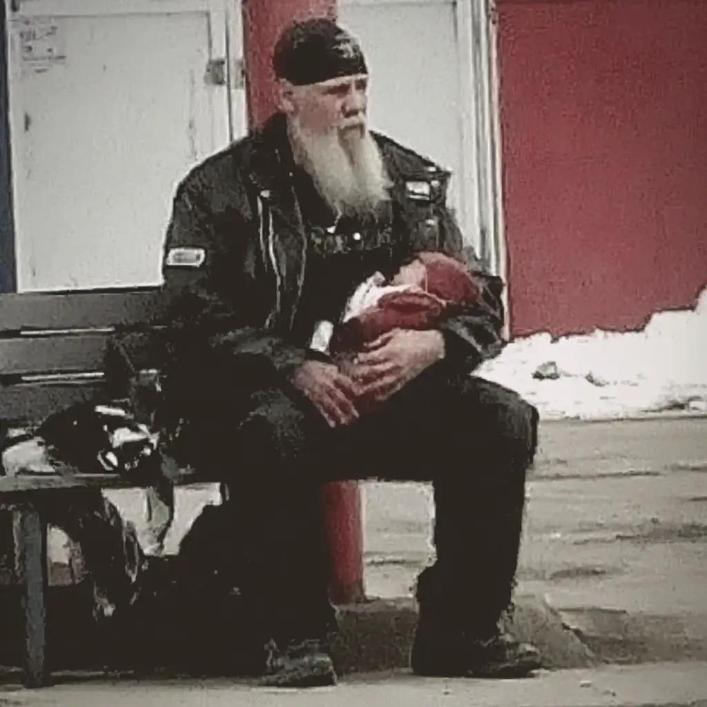 He tucked the baby inside his leather jacket, pressing her against his chest to warm her.