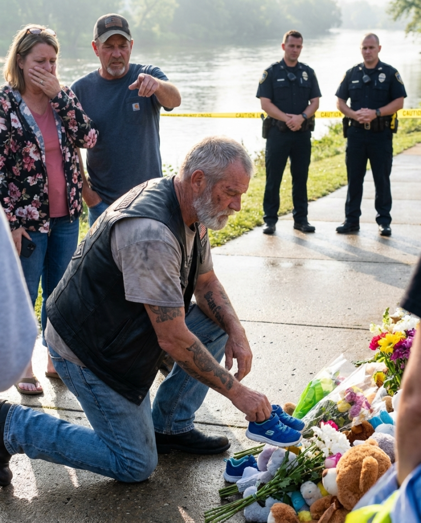 Now the riverbank had become something fragile—half memorial, half spectacle. Flowers leaned against a temporary board. Stuffed animals darkened with dew. A small laminated photo trembled on a string in the breeze.