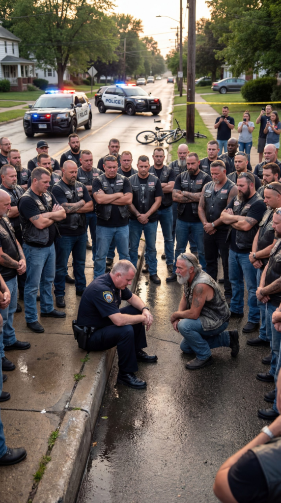 From the sidewalk, the scene looked alarming. A shaken police officer sat alone on the curb while a growing group of bikers walked toward him without saying a word.