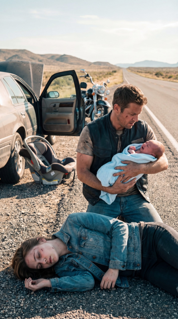 On the ground, half in the thin shade of the van, lay a tiny infant wrapped in a thin blue blanket that had slipped loose during the crash. The baby was frighteningly still. A few feet away, slumped against the driver’s door, was a woman in her thirties. Her forehead was scraped raw, one side of her face streaked with dust and blood. Her eyes were closed. She was breathing — but only just.