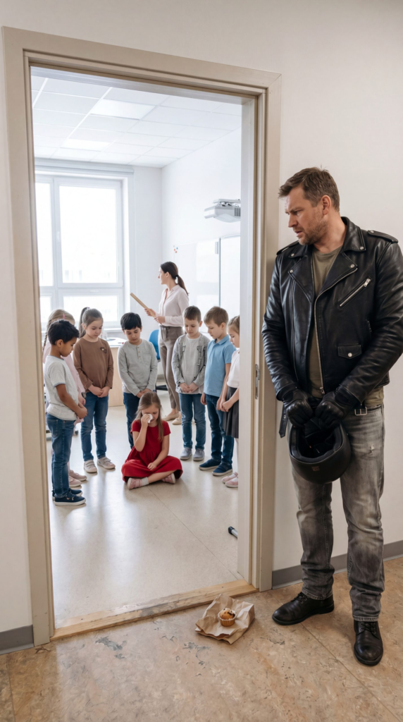Caleb exhaled slowly, adjusted his black leather jacket even though he knew it wouldn’t change how people looked at him, and stepped off the bike. He walked toward the school entrance with heavy but deliberate steps, the small bag swinging gently in his large, calloused hand. He reminded himself that this was supposed to be simple.