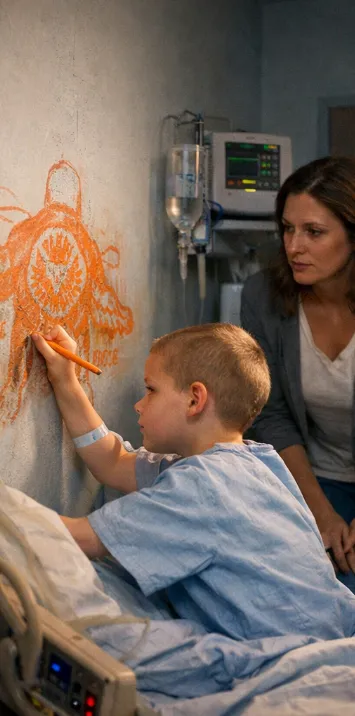 Noah worked slowly, carefully pausing whenever the IV tugged at his arm. The orange pencil scratched softly against the wall, each line steady and deliberate.