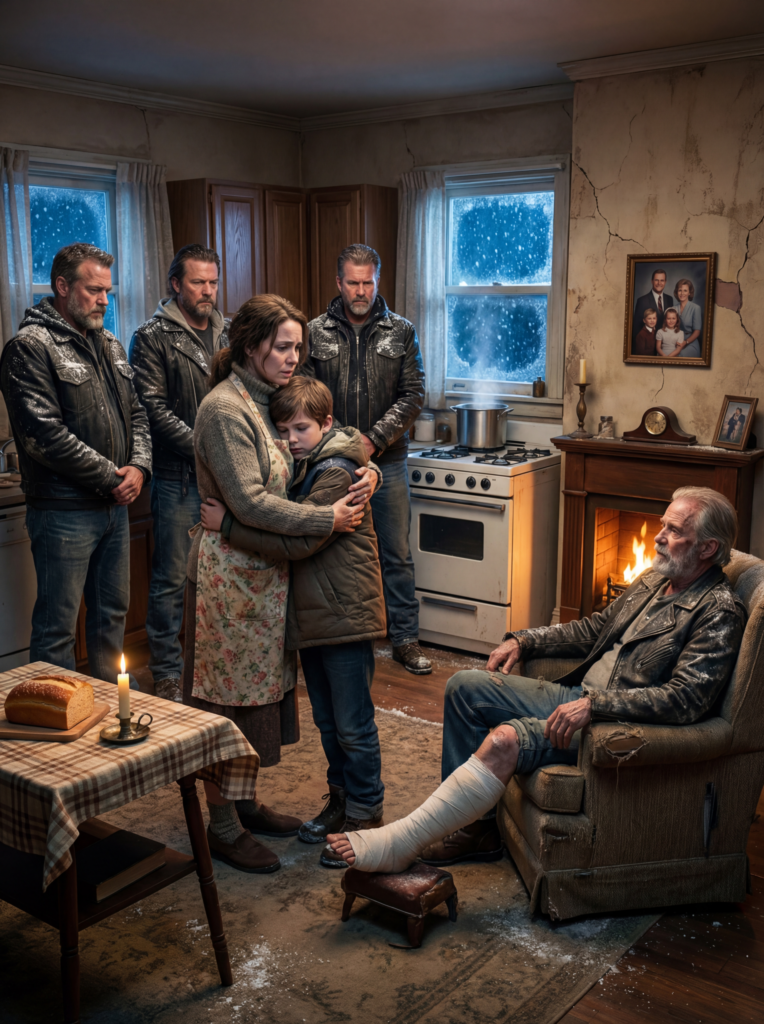 “Travelers,” the leader answered. “We got caught in the storm. Our guy went down on black ice. Roads are closed. We just need warmth. Please.”
