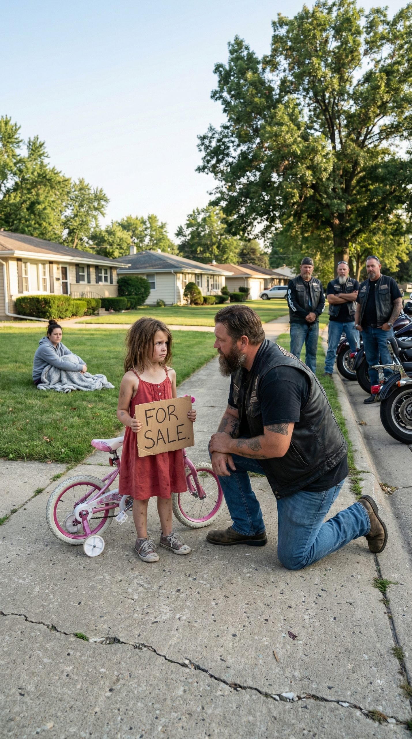 The little girl stepped forward from the sidewalk, her hands trembling as she pushed a small pink bicycle ahead of her. The bike was clearly loved—its paint scratched, its bell slightly crooked, and a white basket hanging from the front. Taped to the handlebars was a piece of cardboard with uneven crayon letters: “FOR SALE.”