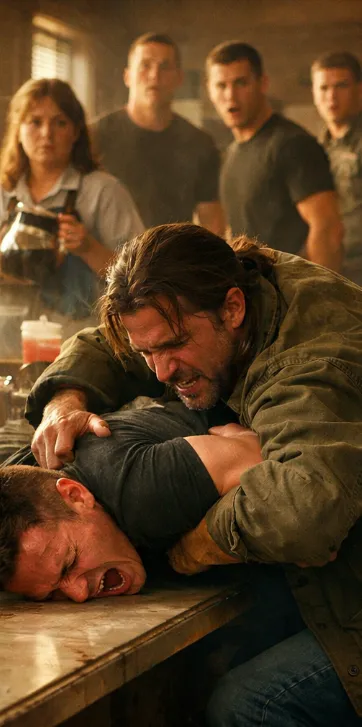 When the door opened, cold midnight air spilled inside, curling through the haze of cigarette smoke, engine oil, and low conversation. The room went still. Chairs scraped softly. A few men straightened without thinking, instincts sharpening as they studied the figure in the doorway.