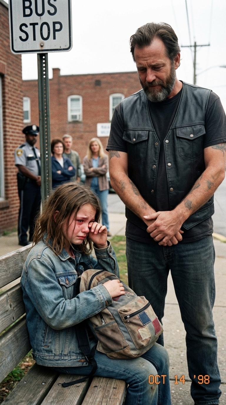 The girl was crying alone at the last bus stop of the day when a biker pulled up beside her—and every adult nearby immediately assumed the worst.