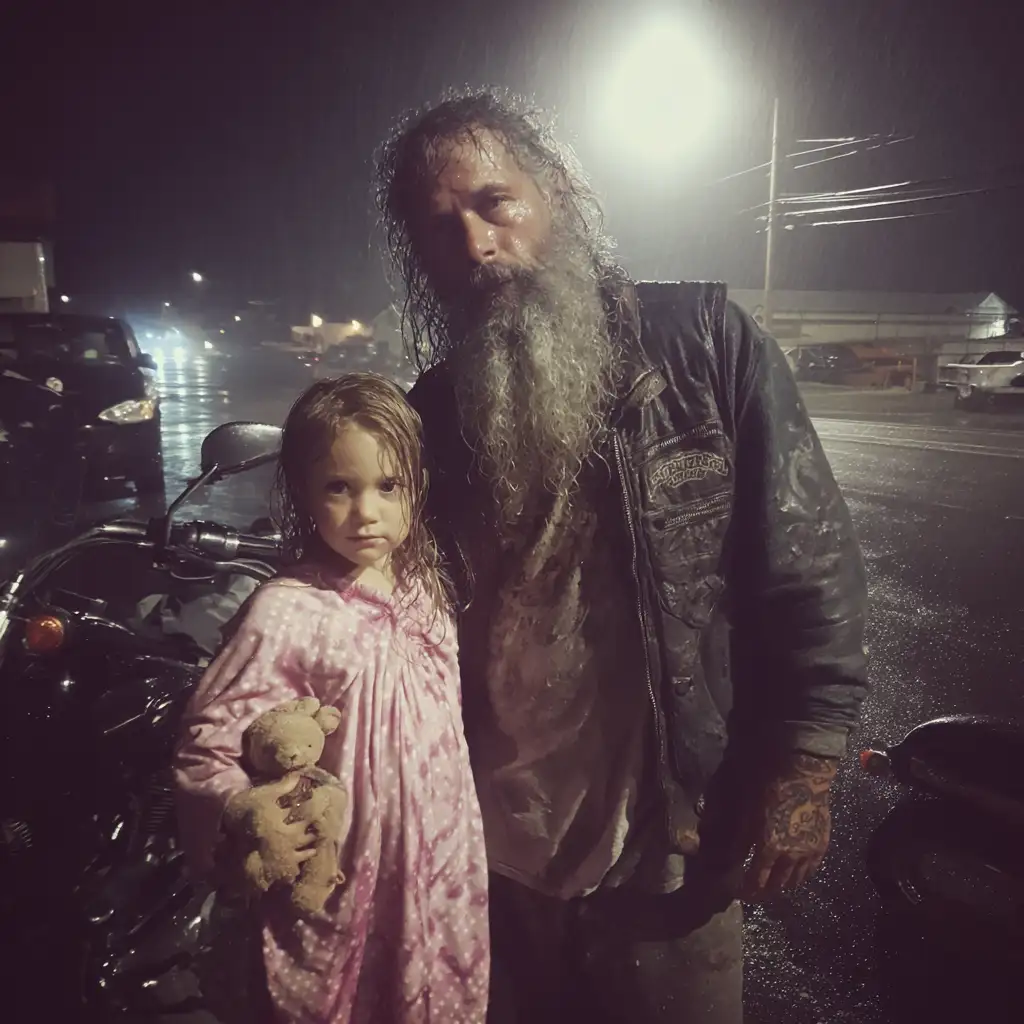 “What’s your name, sweetheart?” I asked gently, removing my leather jacket and wrapping it around her tiny shoulders.