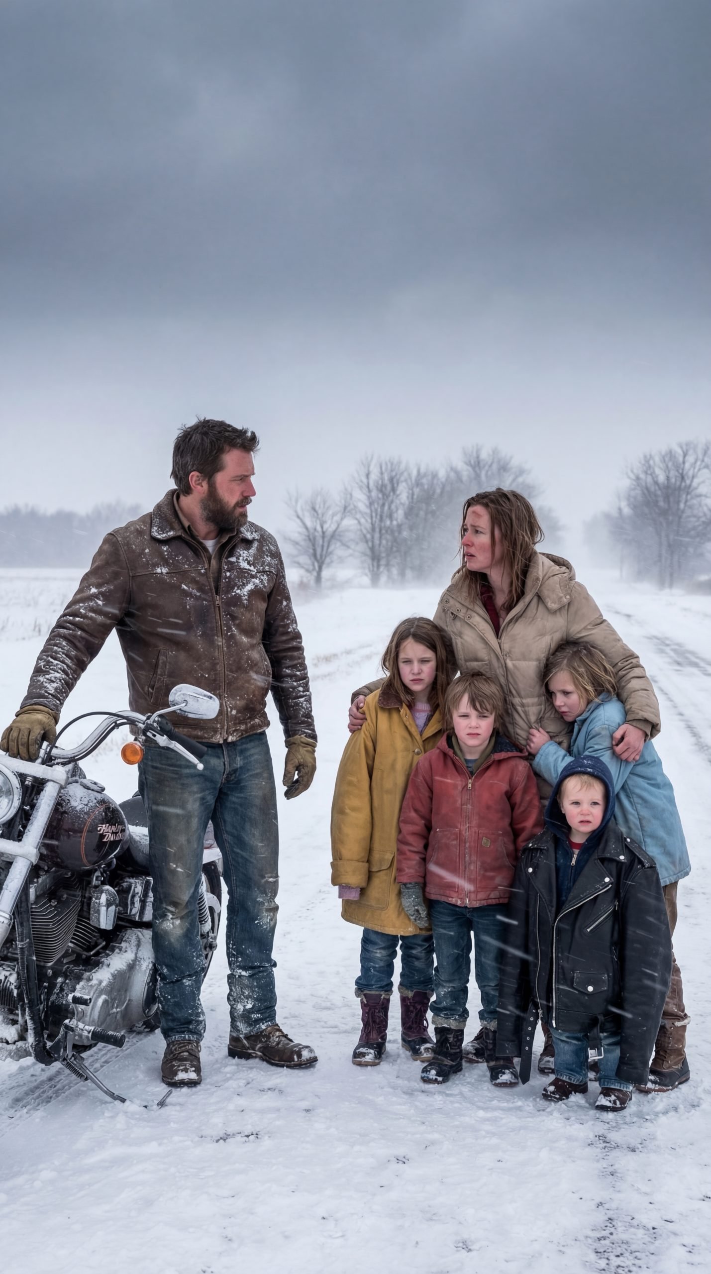 What mattered was the way she looked at him—the worn biker vest beneath his flannel shirt, the beard wet with melting snow, the heavy boots, the motorcycle idling behind him like some rough machine out of a harder life. She studied him in silence, deciding whether he was another danger she could not risk or the only help left between her children and the storm.