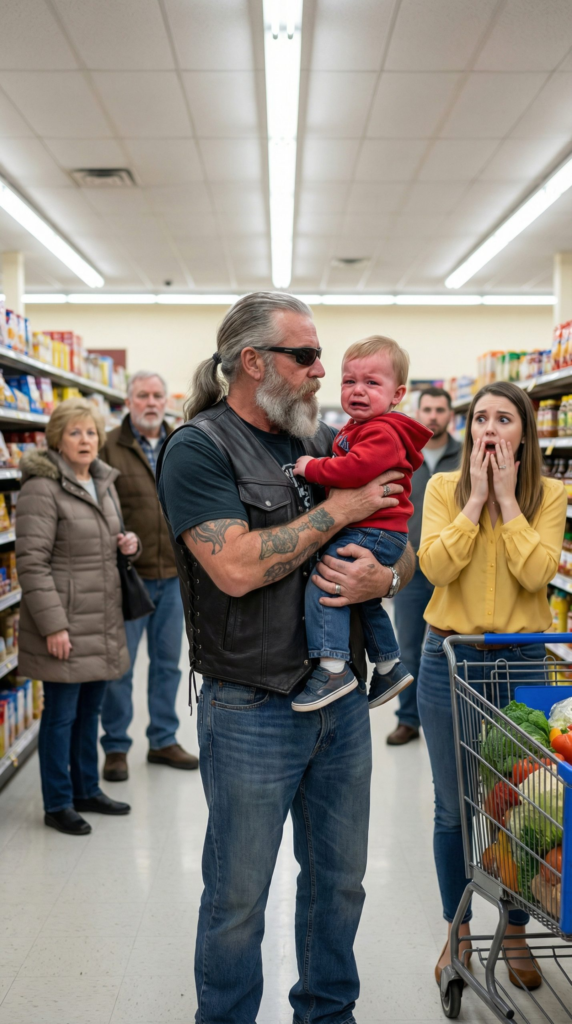 What people remembered later was not the order of events, but the feeling—the way time seemed to tilt sideways when a man in worn black leather moved suddenly through the cereal aisle, his steps quick and deliberate. His arms reached out to wrap around a small child who had been moments earlier tugging at the edge of a shopping cart. The sound that followed wasn’t one sound but many layered together—a basket hitting the floor, a sharp gasp from someone’s chest, a voice rising too quickly to form a sentence, and then another voice, louder, already assigning meaning before understanding had time to catch up.