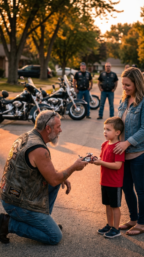 More than thirty motorcycles rolled in with perfect precision, their presence heavy and unmistakable. Leather jackets. Serious faces. Neighbors peeking through curtains, unsure whether to be terrified or amazed.