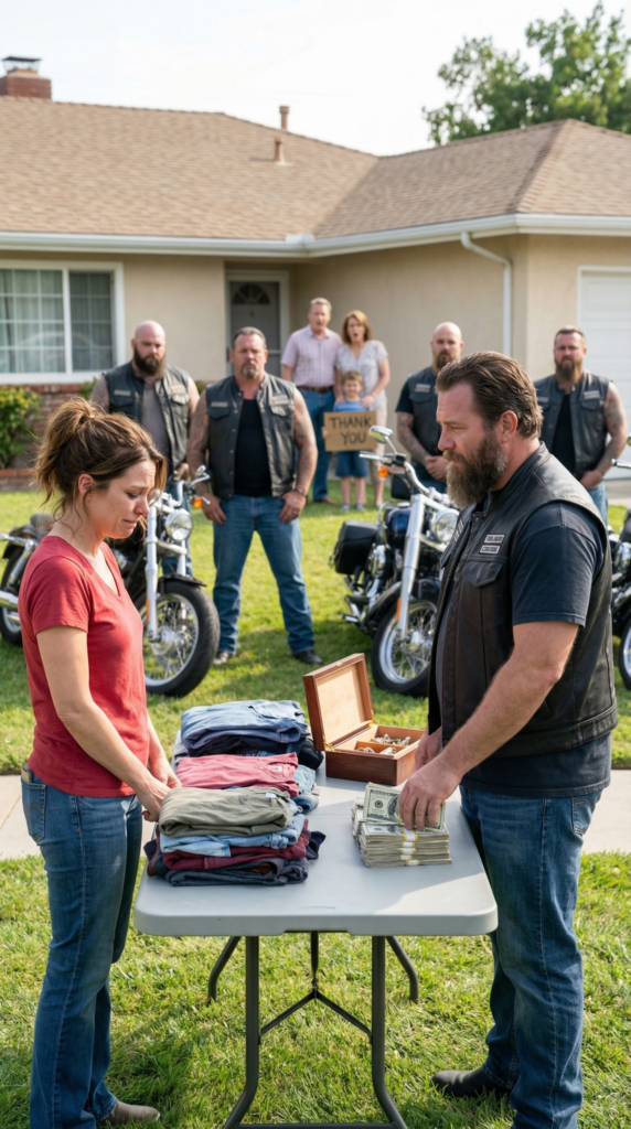 The rider didn’t remove his helmet immediately. He simply sat there with the engine idling, looking over the yard—the table, the crib, the cardboard sign in Eli’s hands.