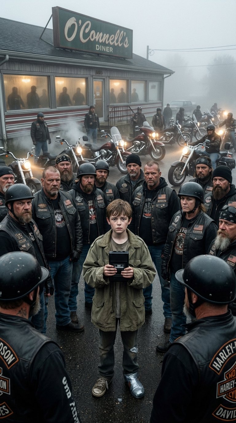 The windows rattled as the parking lot filled with motorcycles, headlights cutting through the fog. Riders stood silently, not threatening—present.