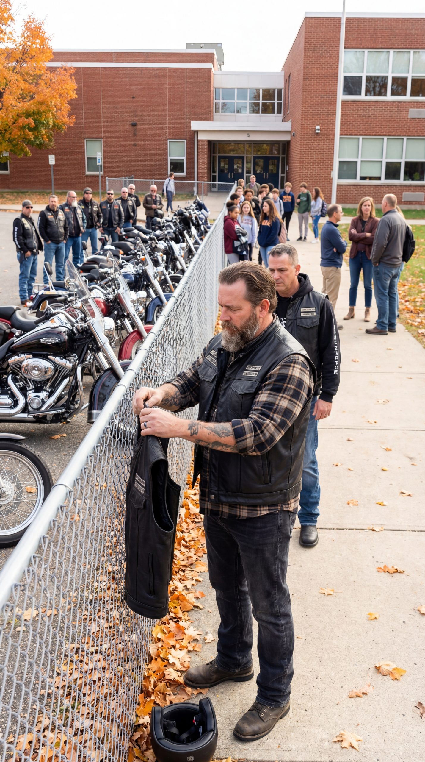 Thirty bikers standing outside a middle school days after a child’s death didn’t look peaceful to worried parents. More people began recording with their phones.