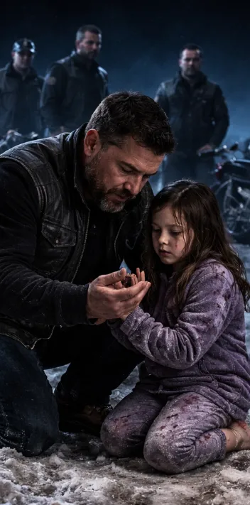 A trail of tiny red footprints stretched across the frozen parking lot behind her, leading straight back toward the woods. She was shaking so violently her entire body trembled, her teeth chattering loudly enough to be heard over the rumbling motorcycles.