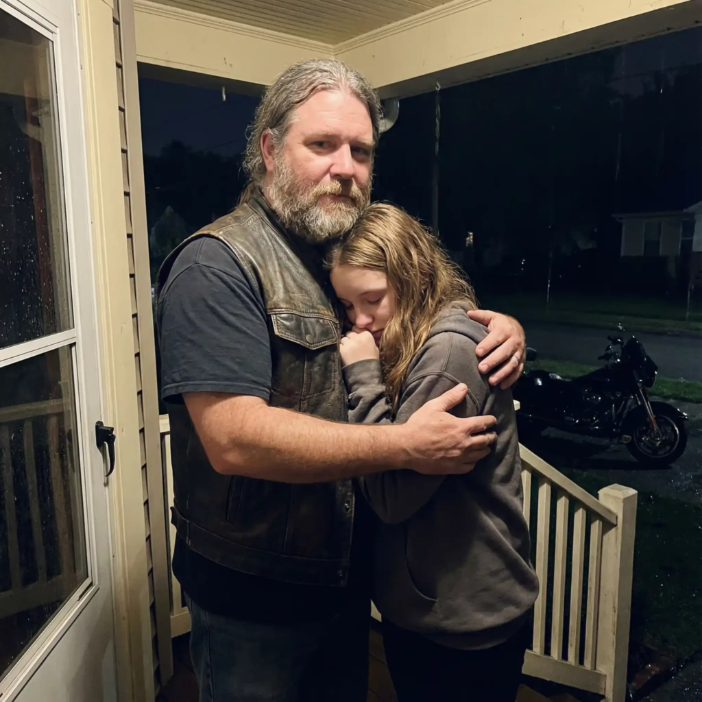 For a split second, my brain refused to process what I was looking at—a massive man in a leather vest, gray beard, tattoos running down both arms. One leg still inside my sixteen-year-old daughter’s room, the other hanging toward the ground.