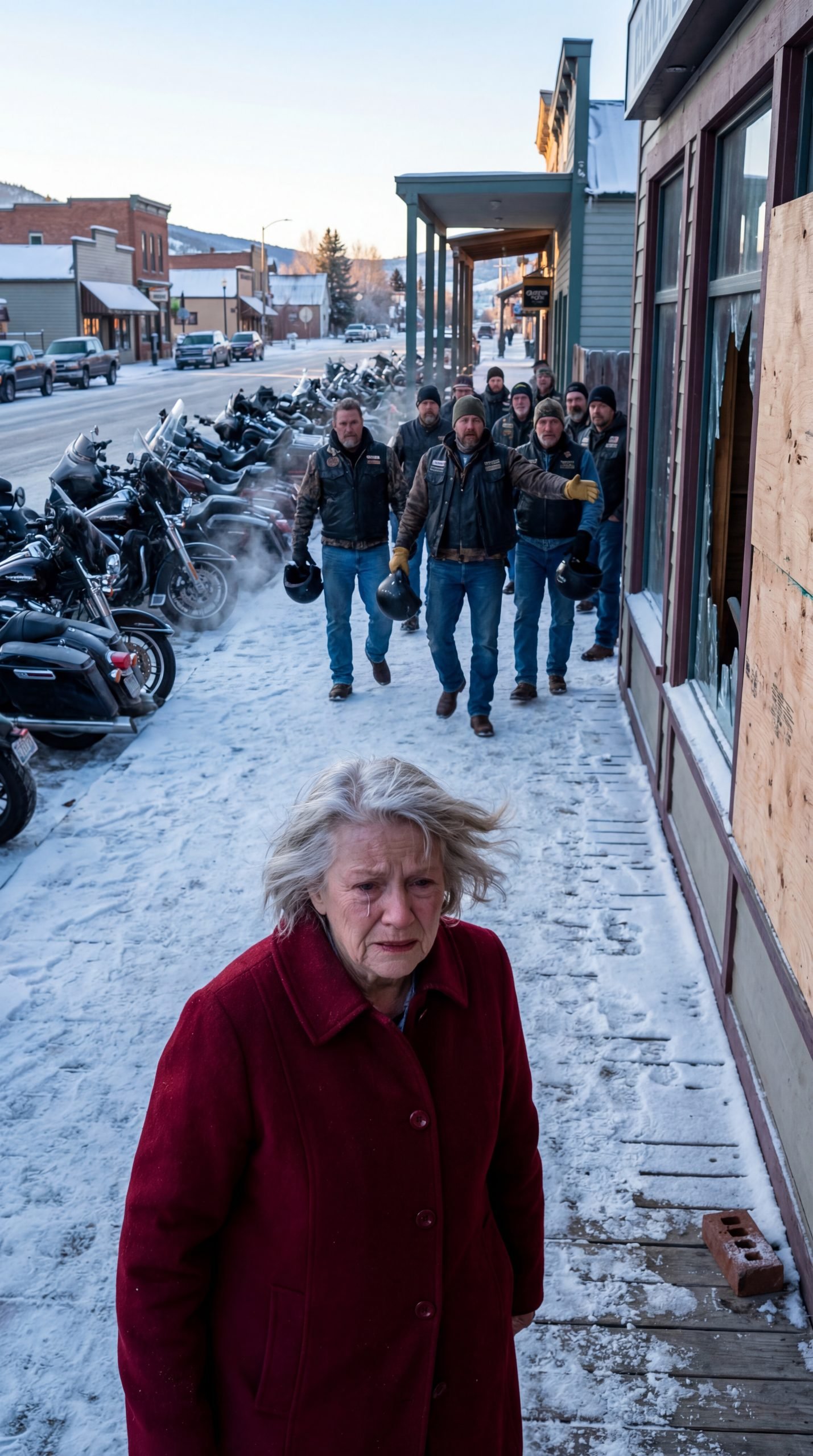 Her hand went straight under the register, gripping the old aluminum bat she kept hidden there. Because in Cedar Hollow, Montana—when winter turns cruel—you don’t wait to see what’s coming.