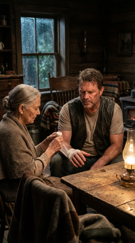 He watched her in silence as she cleaned and wrapped the wound, his jaw clenched, his body tense. He never gave his name, and she never asked. Thunder rattled the windows, but inside the kitchen, there was only the quiet rhythm of care.
