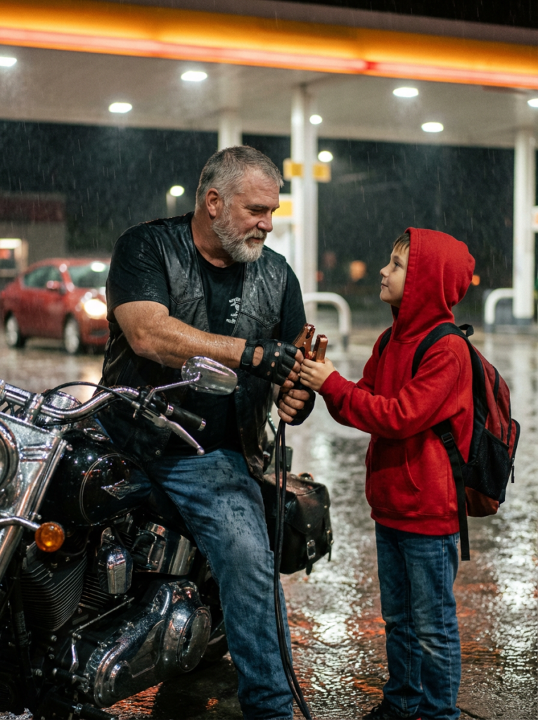 Half-sheltered beneath the sagging roof of the station, its chrome gleamed, unbothered by the storm. Beside it stood a man, broad-shouldered beneath a soaked leather vest. His arms were inked with tattoos that blurred under the rain, but even in the dim light, they told stories of highways, loss, loyalty, and years lived on the edge.