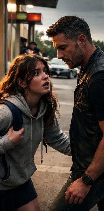 I stood frozen near the gas station window, watching everything unfold like it wasn’t real.
