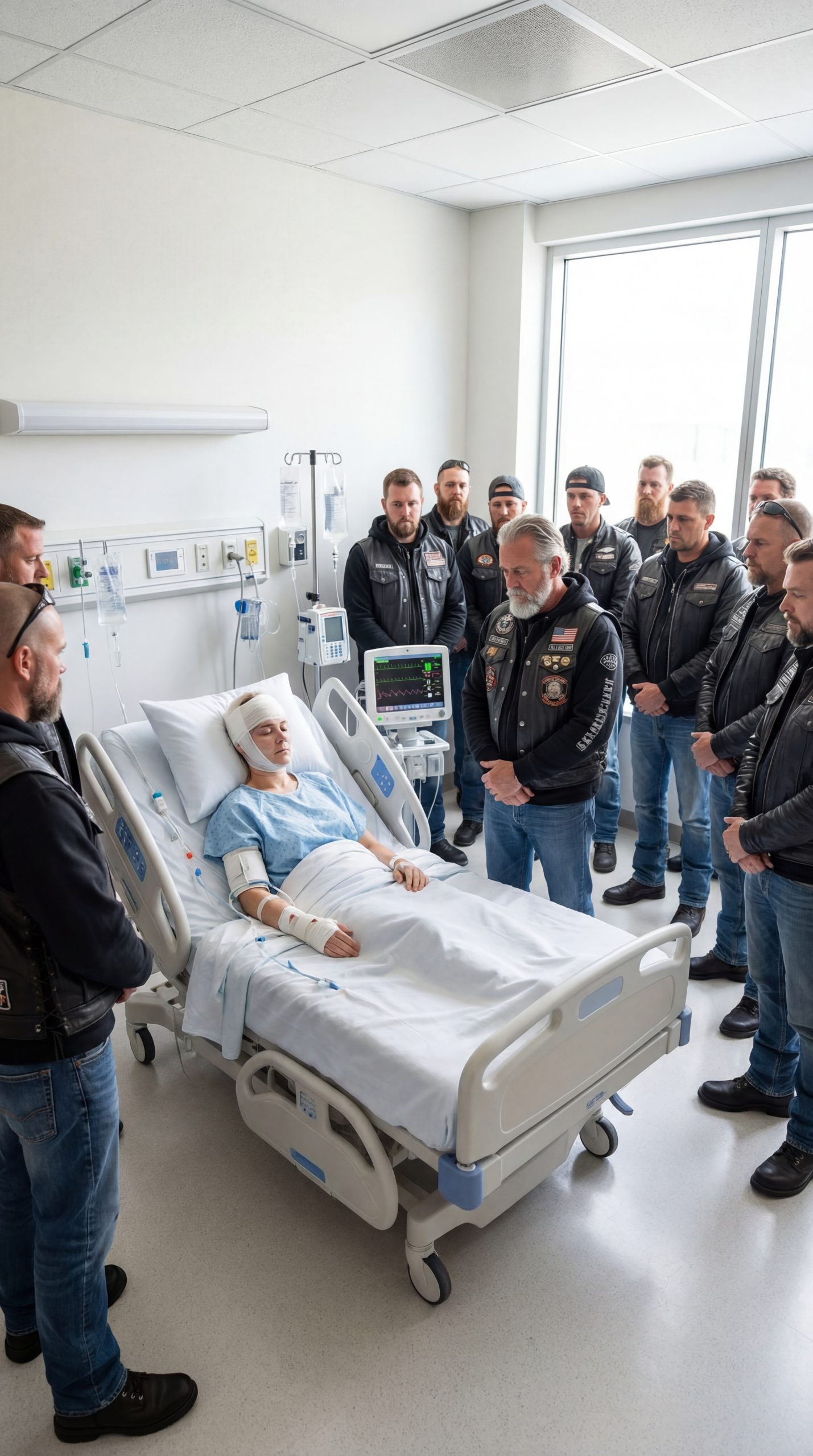The same bikers who took turns guarding the doors also took turns bringing her warm soup, fresh coffee, clean blankets, and pain medicine exactly on schedule. A tattooed giant everyone called Boone adjusted her pillows with the surprising gentleness of a nurse. A younger man named Reed fixed a broken lamp so the light wouldn’t shine directly into her eyes. Another member, Elias, sat on the floor one evening and spent nearly an hour teaching Nolan how to shuffle cards because the boy looked too restless to sleep.
