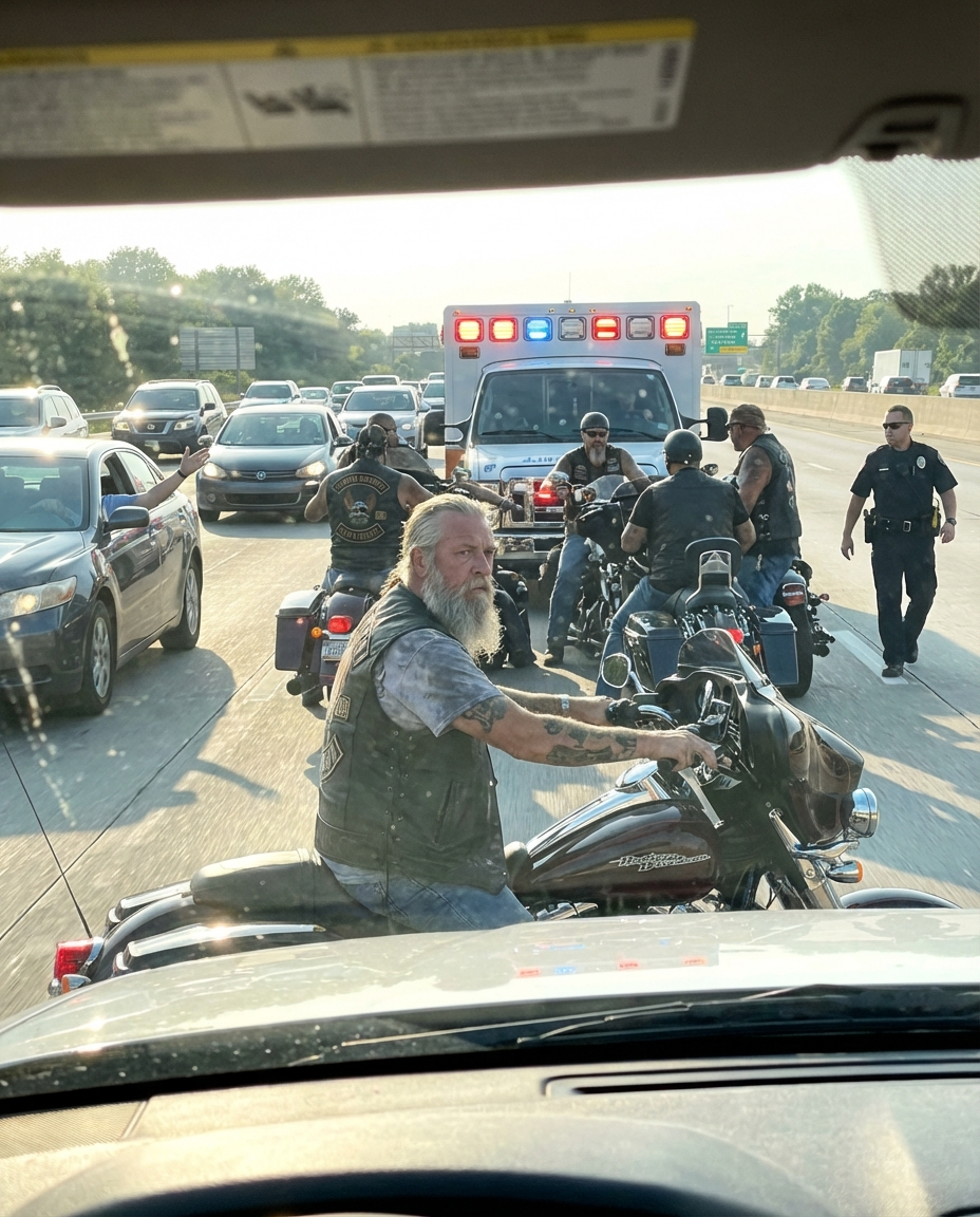 An ambulance forced its way up the shoulder, lights flashing blue and red across glass and chrome. Cars shifted awkwardly, trying to create space where there was none. A van hesitated. A sedan froze halfway into another lane. Traffic collapsed inward.